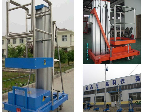 雙柱鋁合金升降機:升降動力分為220V、 380V,或電瓶動力源,特殊環(huán)境也可采用防爆泵站及防爆電器。升高4——10米,載重100-150公斤。主體采用高強度優(yōu)質(zhì)鋁合金材料,具有造型美觀、體積小、重量輕、升降平穩(wěn)、安全可靠等優(yōu)點。廣泛用于工廠、賓館、餐廳、車站、影劇院、展覽館等場所,是保養(yǎng)機具、油漆裝修、調(diào)換燈具、電器、清潔保養(yǎng)等用途的最佳安全伴侶。